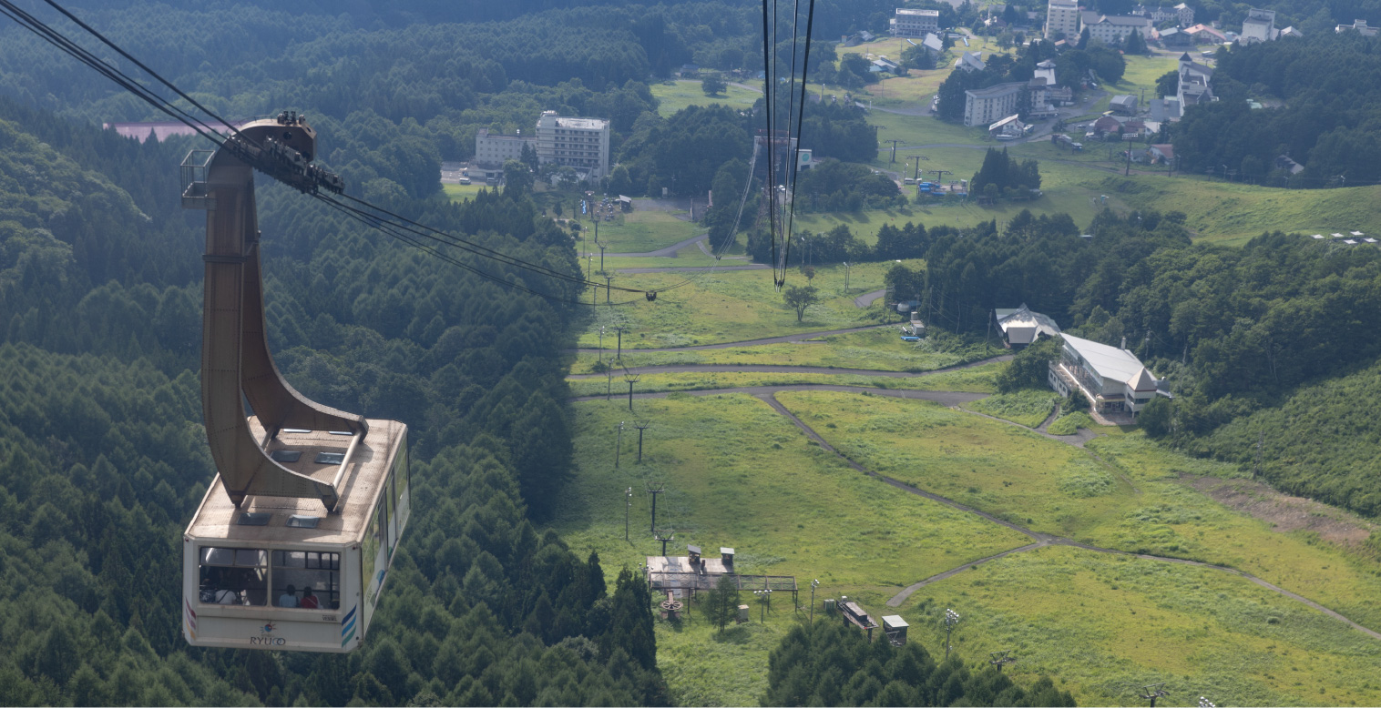 世界最大級166人乗りロープウェイ。およそ10分の乗車で竜王マウンテンリゾートの山頂へ。中腹を過ぎると気温が下がってきていることを体感でき、標高が上がっていることを実感できます。高社山・斑尾山・妙高山が重なって見えるその背景には北アルプスを望むことができます。